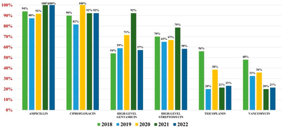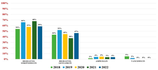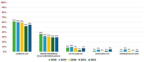 In what concerns the overall antibiotic resistance trends, a slight decrease in resistance was observed every year, with the lowest value being recorded in 2021. In 2022, however, the trend resumed its growth (Figure 2).