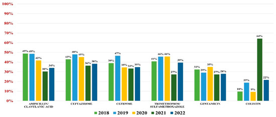Acinetobacter baumannii had an overall antibiotic resistance as follows: gentamicin (84%), ceftazidime (67%), cefepime (67%), imipenem (84%), meropenem (82%), amikacin (66%), and colistin (21%) (Figure 7). Particularly for this pathogen, the percentage of MDR strains has increased from 74% during the first 3 years of our research, to 100% in the last 2 years.