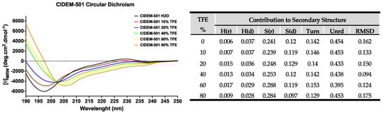 Circular dichroism (CD) spectra of the CIDEM-501 peptide were recorded using a Jasco J-1500 spectrofluoropolarimeter (Jasco Corp., Tokyo, Japan). The peptide was prepared in ultra-pure water at a final concentration of 50 µM. The peptide was titrated with the growing concentration of 2,2,2-trifluoroethanol 10, 20, 40, 60, and 80%. Spectra was measured at 24 °C using 1.0 nm of bandwidth and a 1.0 mm optical path-length quartz cuvette. Eighteen scans were averaged between 250 nm and 190 nm and corrected for the background signal by subtracting the spectra of the appropriate control samples without protein. The mean residue molar ellipticity, [q], was calculated as