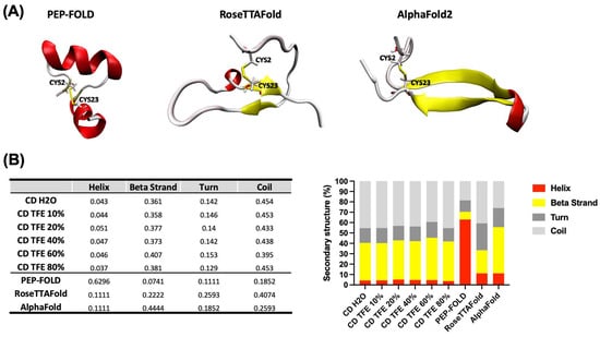 All servers were able to correctly predict the disulfide bridge between Cys2-Cys23, rather they returned different conformations. PEP-FOLD returned rich α-helix structures (H), while RoseTTAFold and AlphaFold2 retrieved two structures based on a mixture of β-strands (B) and disordered structures (T) (Figure 2A), which are in accordance with the obtained data from CD. However, to have a more accurate result and select the theoretical structure closer to the experimental, the percentage of secondary structure for each result was calculated using the secondary structure calculator plugging implemented in VMD (VMD-SS) []. From this analysis we obtained a relation of H:B:T of 63:7:29, 11:22:66, and 11:44:44 for the predicted structures by PEP-FOLD, RoseTTAFold, and AlphaFold2, respectively. The theoretical and experimental data obtained from CD experiments revealed that the predicted structure by AlphaFold2 is closer to the experimental (Figure 2B).