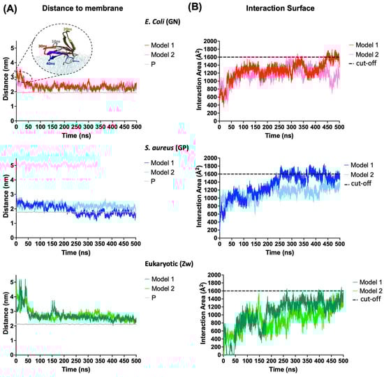 CIDEM-501 showed a higher stability during the simulations for both the bacterial membrane models. The peptide binds to bacterial membranes instantly regardless of the starting position (model 1 or 2, see Section 4.3) and remains attached throughout the simulation. In contrast, for the eukaryotic (Zw) membrane model, the peptide takes longer to bind to the zwitterionic membrane in both models 1 and 2. Nevertheless, the distances observed at the beginning of GN simulations were attributed to the flipping of CIDEM-501 over the membrane (Figure 3A). Thus, the peptide is located closer (average < 0.5 nm) to the negatively charged lipids head phosphate than in Zw membranes (average > 0.5 nm), where it is slightly away (Table 2). In fact, CIDEM-501 is closer to the center of the Gram-positive (GP) membrane than to the center of the Gram-negative (GN) membrane, especially in model 1 where it was able to pass the borderline of the lipid head. These results are also supported by the analysis of the surface area of peptide–membrane interaction (Figure 3B). The peptide showed higher values of interaction area with the bacterial membranes (>1400 A2) than eukaryotic ones, since they reach the stability time at 200–500 ns. It shows constant and stable interactions with GN and GP membranes while in the eukaryotic the peptide won and lost interaction during the simulation. All these results suggest that CIDEM-501 settles smaller distances and larger areas of interaction with the bacterial mimetic membrane in the more extended period evaluated than with the eukaryotic membrane model used.