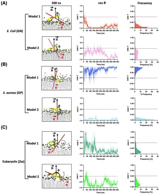 Orientation of CIDEM-501 on the GN (A), GP (B), and Eukaryotic (C) membrane models according to the angle (θ) between the electric dipole (, red arrow) and the membrane surface normal (, black arrow) in function of time. The final snapshots of each simulation are presented.