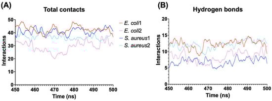 Interaction between the peptides and bacterial membrane models. (A) Total of interactions using a distance cutoff of 3 Å from the peptide. (B) Number of hydrogen bonds between the peptide and membrane models.
