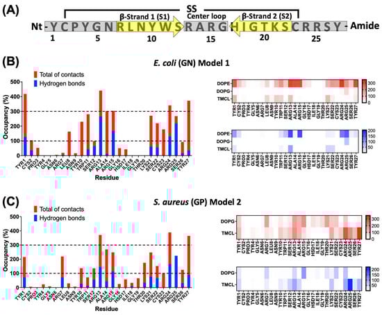 Interaction analysis per residue of the peptide-bacterial membrane complexes. (A) General depiction of the relation between primary sequence and secondary structure for CIDEM-501. Gray bars and yellow arrows represent the disordered and β-sheets structures, respectively. Per residue interaction of CIDEM-501 with GN (B) and GP (C). The histograms represent the total of contacts (red) and hydrogen bonds (blue) during the last 50 ns for each residue. The heat maps include the analysis per residue and lipid. To facilitate analysis, discontinued lines represent two random cut-offs (100% and 300%).