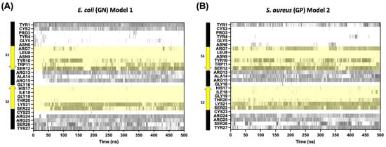 Finally, an analysis of the hydrogen bond formations per residue was performed to better understand the adsorption kinetics of CIDEM-501 on the bacterial membranes. For both simulations, a good pattern of interactions was found to involve the terminal regions and the center loop. Also, some residues from the S1 β-strands are involved, which includes the residues from N-terminus (Tyr1 and CYS2) and C-terminus (Arg24, Arg25, Ser26, and Tyr27) (Figure 7). However, the center loop takes longer to interact (~40–50 ns), consistent with the conformational change observed for the peptide in Figure 3. For GP simulations, a fast and stable interaction since the starting point was observed for the terminal and center loop (Figure 7B). These results also support the orientation analysis represented in Figure 4.