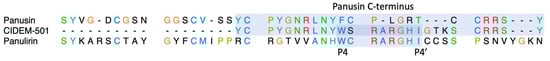 Sequence alignment of Panusin, CIDEM-501, and Panulirin. Residues colors correspond with the properties of conserved residues, blue (hydrophobics), red (positive charged), green (polar), orange (glycines), yellow (prolines), cyan (aromatic), and black (unconserved).