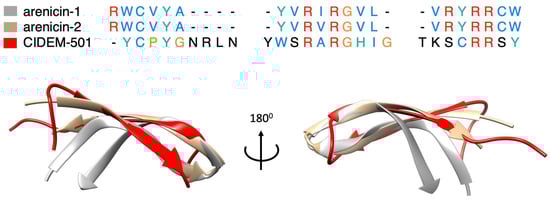 Sequences and structures comparison of CIDEM-501 (red) and the two arenicin isoforms, arenicin-1 (gray) and arenicin-2 (brown). Residues colors correspond with the properties of conserved residues, blue (hydrophobics), red (positive charged), green (polar), orange (glycines), yellow (prolines), cyan (aromatic), and black (unconserved).