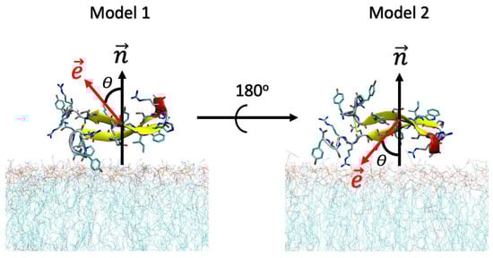 Additionally, simulations were carried out with two initial poses of CIDEM-501 on the membrane surfaces to obtain proper samplings. In both cases, the peptide is parallel to the membrane. However, in model 1, the electric dipole moment vector is pointed out to the membrane. In model 2, the peptide was rotated 180° around the axis, locating the vector to the membrane surface (Figure 10).