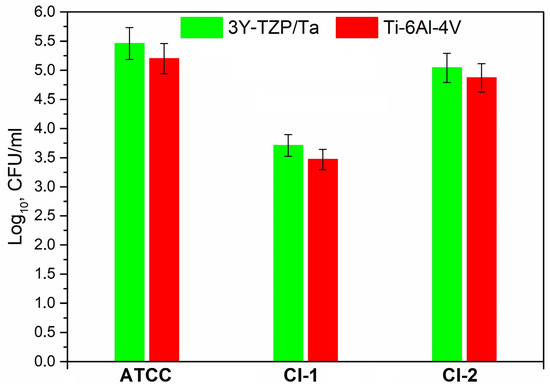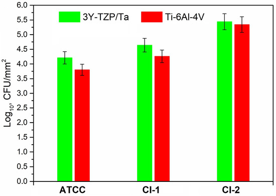 Figure 4 exhibits the adherence of the viable S. oralis strains (log10 CFU/mm2) to the 3Y-TZP/Ta biocermet and titanium alloy surfaces. The 3Y-TZP/Ta biocermet and Ti-6Al-4V disks had no major differences in terms of the colony counts.