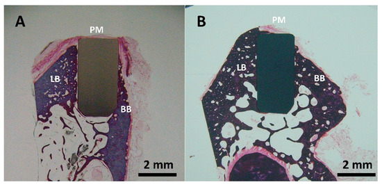 Representative buccal—lingual section of implanted ceramic (A) and biocermet (B) rods (PM: peri-implant mucosa; BB: buccal bone; LB: lingual bone).