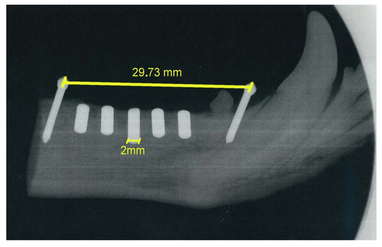 The mandibular block containing the implant was removed from the mandible using an oscillating autopsy saw (Exakt, Kulzer, Germany) and stored in a 5% formaldehyde solution (pH 7). The position of the implants was confirmed by radiographic examination (Figure 9).