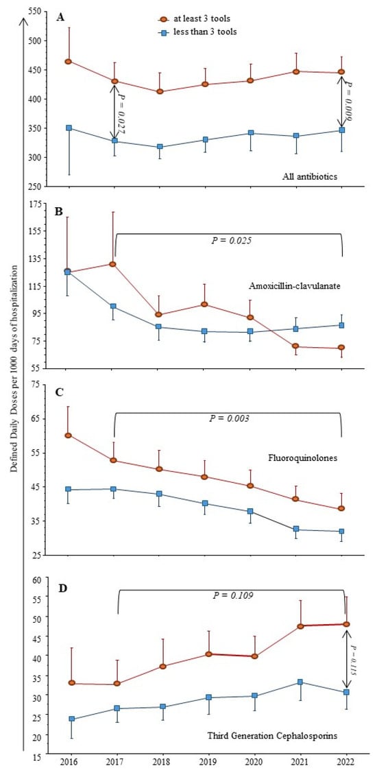 - Pakyz, A.L.; Moczygemba, L.R.; Wang, H.; Stevens, M.P.; Edmond, M.B. An evaluation of the association between an antimicrobial stewardship score and antimicrobial usage. J. Antimicrob. Chemother. 2015, 70, 1588–1591. [Google Scholar] [CrossRef] [PubMed][Green Version]
