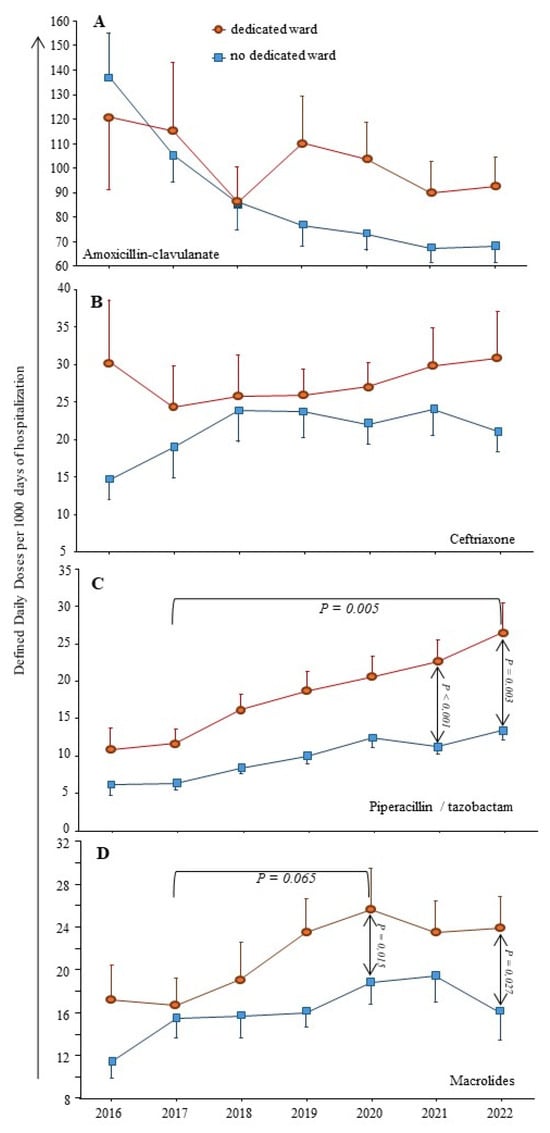 - Friedli, O.; Gasser, M.; Cusini, A.; Fulchini, R.; Vuichard-Gysin, D.; Tobler, R.H.; Wassilew, N.; Plüss-Suard, C.; Kronenberg, A. Impact of the COVID-19 pandemic on inpatient antibiotic consumption in Switzerland. Antibiotics 2022, 11, 792. [Google Scholar] [CrossRef] [PubMed]