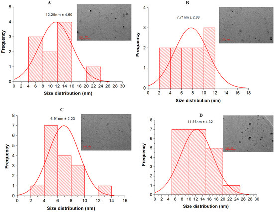 Core size distribution and TEM images of gelatin-capped AgInS2 QDs-ADEP1 analogue conjugates and their (A): AgInS2 QD-SC005; (B): AgInS2 QD-SC006; (C): AgInS2 QD-SC007; (D): AgInS2 QD-SC008.