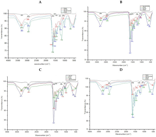 FTIR analysis of functional groups involved in gelatin capping of AgInS2 QDs, and AgInS2 QDs conjuction with ADEP1 analogues. (A) SC005, (B) SC006, (C) SC007 and (D) SC008.