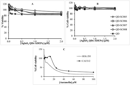 Effect of AgInS2 QD-ADEP1 analogue conjugates (A) on HEK-293 and (B) Caco-2 cell viability. Cells treated with auranofin (C) were used as a positive control.
