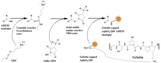 Gelatin-capped AgInS2 QDs were functionalized with ADEP1 analogues via EDC/sulfo-NHS coupling chemistry, as demonstrated in Scheme 2. The carboxylic groups of the ADEP1 analogues were activated in the absence of the gelatin-capped AgInS2 QDs. The gelatin contains an amine (NH3+) which is readily available to form an amide bond with the activated COO− end of the ADEP1 analogues. Treatment of the ADEP1 analogues with EDC/sulfo-NHS in the presence of gelatin-capped AgInS2 QDs could potentially result in intramolecular coupling between these carboxylic groups and the amine groups on the gelatin. The conjugation utilized the gelatin lysine amino group on the surface of the AgInS2 QDs and the carboxylic group on the C-terminal of the ADEP1 analogues to form an amide bond [20].