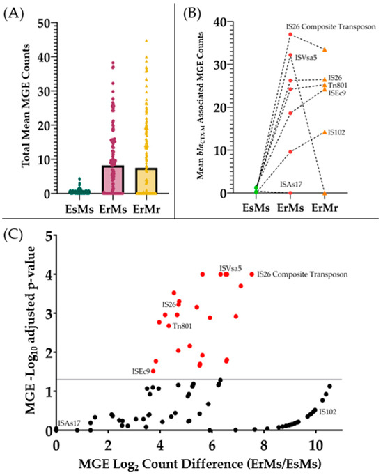 blaCTX-M-associated mobile genetic elements (MGEs) across three carbapenem phenotypes. Five ertapenem- and meropenem-susceptible (EsMs) with blaCTX-M, five ertapenem-resistant but meropenem-susceptible (ErMs), and four ertapenem- and meropenem-resistant (ErMr) E. coli were annotated for MGEs with MobileElementFinder database v1.0.2 (https://cge.food.dtu.dk/services/MobileElementFinder/, accessed on 29 June 2023). (A) Total annotation counts were compared across all phenotypes (Supplemental Data S1). (B) MGE annotations interposed by (composite transposons) or upstream from blaCTX-M were counted and plotted across all phenotypes. (C) is a volcano plot comparing all MGE counts between EsMs and ErMs. Log2-fold count difference between ErMs and EsMs MGEs were plotted against Log10-transformed adjusted p-values (two-way ANOVA) of all MGEs between these two phenotypes. Values above 1.3 Log10 (p < 0.05; grey line) were considered statistically significant. All red MGEs are present at higher frequencies in ErMs than in EsMs E. coli.