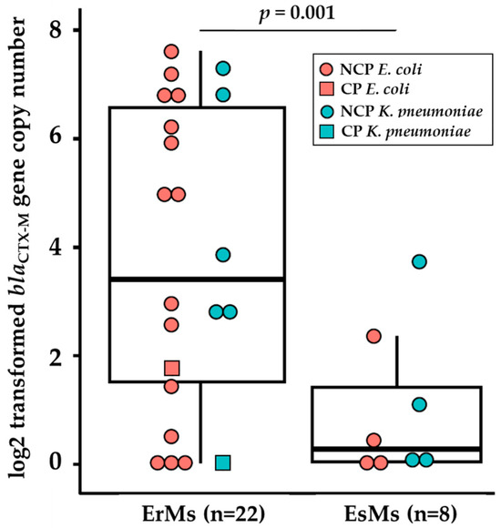 Based on these data, we quantified the log2-transformed ΔΔCt of blaCTX-M among a larger set of ErMs, using the formula ΔΔCt = 2(ΔCTcontrol − ΔCTtarget). The EsMs E. coli isolate EC87 was used as the blaCTX-M control strain as it harbored a single copy of blaCTX-M relative to rpsL with a log2 ΔΔCt of zero. We examined sixteen ErMs E. coli (Figure 2), six ErMs K. pneumoniae, four EsMs E. coli, and four EsMs K. pneumoniae. Overall, 82% (18) of the 22 ErMs harbored blaCTX-M-15 or blaCTX-M-14, while the four remaining ErMs had no detectable blaCTX-M (Figure 2). Furthermore, ErMs isolates harboring blaCTX-M carried 4-fold more log2-transformed copies of blaCTX-M than ceftriaxone-resistant EsMs (3.7 vs. 0.9, p < 0.001) across both species and carbapenemase status. Interestingly, NCP-ErMs had 3-fold more blaCTX-M copies than CP-ErMs (4.0 vs. 0.8) (Figure 2).