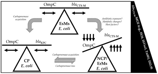 Diagram depicting the balance between β-lactamase copy number, OmpC expression (present/absent), and mobile genetic element abundance among carbapenemase-producing (CP), non-carbapenemase-producing (NCP), ertapenem-resistant, meropenem-susceptible (ErMs), and ceftriaxone-resistant but ertapenem- and meropenem-susceptible (EsMs) E. coli. Black double-headed arrows represent wildtype expression or copy number of OmpC protein or β-lactamase gene; black single-headed arrows indicate up or down expression or copy number compared to wildtype; large grey arrows represent theoretical changes required among EsMs E. coli to develop an ErMs phenotype; small grey single pointed arrows represent theoretical changes required among ErMs E. coli to develop a CP or NCP genotype. As carbapenemase enzymes, like blaKPC, are harbored in E. coli, OmpC expression is maintained in the presence of carbapenem exposure. However, if blaCTX-M is present in NCP E. coli, carbapenem exposure drives an increase in blaCTX-M copies and a decrease in OmpC expression.