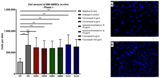 Cells per dish: Mean cell amount per group of BM-hMSCs in vitro in Part I assessed by DAPI staining. Fungicides were added to cell culture medium in the concentration displayed on the right side. The error bars show the error of the mean. Significances are indicated by stars; bars under the stars indicate the compared group for each significance. n ≥ 5. ***: p < 0.001. Picture (A) displays an example picture of a DAPI microscopy of the negative control and picture (B) displays the osteogenic control.