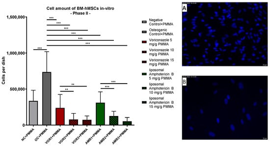 Cells per dish: mean cell amount per group of BM-hMSCs in vitro in Part II assessed by DAPI staining. A 0.5 g PMMA cement chip was placed in the center of every dish. Fungicides were admixed to PMMA in the concentrations displayed on the right side. The error bars show the error of the mean. Significances are indicated by stars; bars under the stars indicate the compared group for each significance. n ≥ 4. **: p < 0.01, ***: p < 0.001. Picture (A) displays an example picture of DAPI microscopy of osteogenic control + PMMA and picture (B) displays an example picture of liposomal Amphotericin B 15 mg/g PMMA.