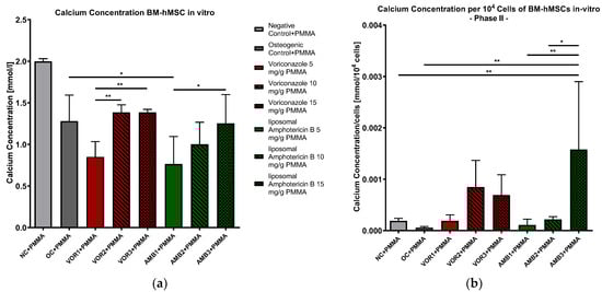 (a) Calcium concentration in supernatants of BM-hMSC in vitro. Mean calcium concentration per group of BM-hMSCs in vitro in Part II in mmol/L. n = 6. (b) Calcium concentration per 104 cells in supernatants of BM-hMSC in vitro. Mean calcium concentration per group of BM-hMSCs in vitro in Part II normed per 104 cells. n ≥ 4. A 0.5 g PMMA cement chip was placed in the center of every dish. Fungicides were admixed to PMMA in the concentrations displayed in the middle. The error bars show the error of the mean. Significances are indicated by stars; bars under the stars indicate the compared group for each significance. *: p < 0.05, **: p < 0.01.