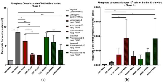 After calculating the quotients of phosphate concentrations per 104 cells, we detected the highest quotients in VOR2 + PMMA (0.00375 mmol/104 cells) and AMB3 + PMMA (0.00367 mmol/104 cells). While the phosphate concentrations per cell constantly rose with higher LAMB concentrations, the phosphate concentrations per cell showed a bell-shaped curve with rising VOR concentrations. Consequently, only VOR2 + PMMA and AMB3 + PMMA revealed significantly higher concentrations compared to NC + PMMA and OC + PMMA, as shown in Figure 6b.