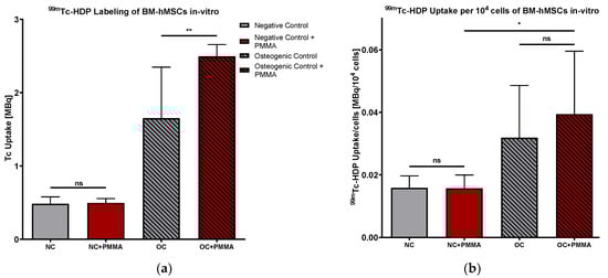 (a) 99mTc-HDP uptake in MBq. Mean 99mTc-HDP uptake per group of BM-hMSCs in vitro. n = 6 (b) 99mTc-HDP uptake in MBq per 104 cells. Mean 99mTc-HDP uptake per group of BM-hMSCs in vitro was normed for 104 cells. n ≥ 4. In NC + PMMA and OC + PMMA, a 0.5 g PMMA cement chip was placed in the center of every dish. The error bars show the error of the mean. Significances are indicated by stars; bars under the stars indicate the compared group for each significance. ns: not significant, *: p < 0.05; **: p < 0.01.