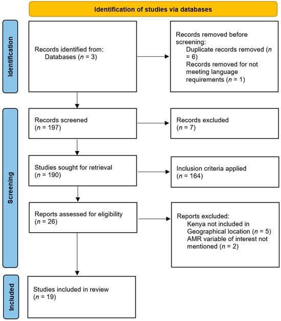 The search process identified potential articles that were screened for language and duplicates based on titles and abstracts. After the initial screening, potentially relevant papers were selected for further review. Subsequently, full-text screening was conducted by applying the inclusion criteria, leading to the exclusion of articles. During the data extraction stage, articles were excluded if they did not mention an AMR variable of interest or if their geographic location did not include Kenya. This thorough process resulted in the final set of articles (n = 19) being included in the review, as depicted in Figure 1.