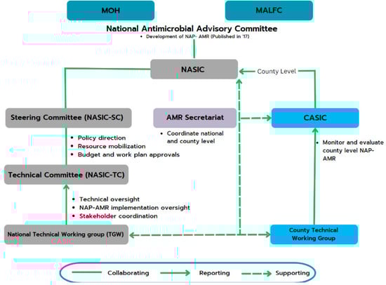 - At the national level, the National Antimicrobial Stewardship Interagency Committee (NASIC) and Technical Committees oversee and guide AMR-related activities. These committees report to the MOH and the Ministry of Agriculture, Livestock, Fisheries, and Cooperatives for guidance and funding.