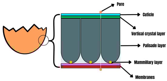 The eggshell generally has two predominant functions: nourishing and protecting the embryo. This protective function encompasses defense against pathogens, which is effective thanks to the interaction between the physical barrier capacity and the antimicrobial proteins present in the eggshell [16]. In addition to having pores, the eggshell is subdivided into the cuticular, vertical crystal, palisade, and mammillary layers, and the outer and inner membranes (Figure 1) [17]. The cuticle is the upper layer, rich in polysaccharides, hydroxyapatite crystals, lipids, and glycoproteins [18]. The eggshell comprises the lower layer, the vertical crystal, formed by crystals aligned perpendicular to the surface, the palisade layer, composed of calcite crystals embedded in an organic matrix, and the mammillary layer, consisting of calcified columns and cones that penetrate the shell membranes [19]. The inner layers, formed by the outer and inner membranes, represent the basal protective layer of the eggshell, composed of protein fibers [17,19].
