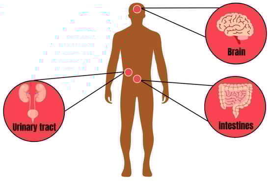Although this review does not directly focus on human health, it is imperative to recognize that the seriousness of microbial contamination in hatcheries, poultry farms and slaughterhouses cannot, under any circumstances, be ignored. Human health must always prevail over any poultry production process. Both ingestion and inhalation are crucial routes of direct exposure to microbial contamination in humans, covering both occupational and non-occupational contexts. Hatcheries, poultry farms and slaughterhouses pose potential risks to humans, both in terms of contamination through inhalation and the possibility of ingestion if the final products intended for consumption are contaminated, as these products are considered one of the main reservoirs of E. coli [40]. An additional concern arises when products initially supplied to commercial establishments, in accordance with microbiological standards, end up suffering contamination during storage, especially if this occurs under inadequate climatic and sanitary conditions. The consequences resulting from the inhalation or ingestion of E. coli can manifest themselves in humans as acute or chronic infections, compromising the integrity of human health. Some such infections include urinary infections that may or may not be associated with cases of bacteremia [41], intestinal problems, including diarrhea [42], and meningitis, associated with significant mortality rates, or with a high risk of developing serious neurological sequelae [42,43] (Figure 2).