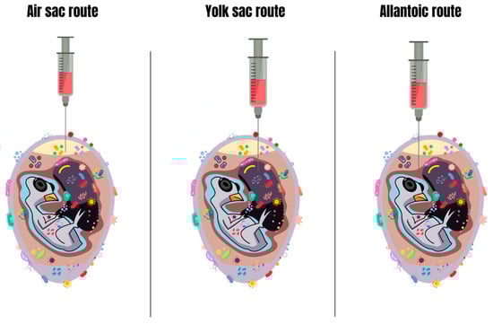 To understand the in ovo drug administration route, it is necessary to understand the physiology of embryonic development. Among the various in ovo injection routes, the amniotic route, as mentioned earlier, is the most popular approach for in ovo drug administration. The main advantage of the drug administration system via the amniotic route, compared to other in ovo delivery routes (Figure 4), is the rapid distribution of the compound to the embryo. According to Williams [47], after being deposited in the amnion, therapeutic substances are rapidly absorbed orally and through the mucosal surfaces of the embryo’s respiratory and digestive tracts. Antibacterial therapies require that pharmacological agents act quickly on the body of the target organism to provide protection and/or treatment. In this context, the amnion stands out as the best option for prevention or treatment against E. coli in embryos, since the drugs deposited in it normally have an efficacy rate above 90% [57].
