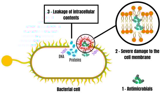 As noted previously, successful antimicrobials demonstrate high efficacy in long-lasting prevention and rapid treatment of poultry infection-causing pathogens such as E. coli, providing systematic protection that effectively limits or prevents the spread of infection in farming systems. Many antimicrobials demonstrate success in combating E. coli due to their action mechanisms that result in the death of this bacterium. It has been elucidated that natural antimicrobials may have the ability to cause damage to the cell membrane of E. coli, resulting in the leakage of proteins and nucleic acids (Figure 5). This phenomenon triggers the destabilization of metabolic activity, ultimately culminating in bacterial cell death [70]. In the same way, synthetic chemical antimicrobials can also induce disturbances in the cell walls and membranes of E. coli, reducing its protection and resulting in the loss of intracellular content [71]. This is the most elucidated antibacterial mechanism.
