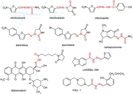 There exist medicinal substances based on NAH (Figure 1), such as nitrofurazone (broad-spectrum topical antibacterial agent) [24]; nitrofurantoin (oral antibacterial agent for treating gastrointestinal tract infections) [25]; nifuroxazide (antibacterial agent of use with gastrointestinal infections); carbazochrome (hemostatic agent, tested with good results against hereditary hemorrhagic telangiectasia) [26,27]; dantrolene and azumolene (approved for the treatment of malign hyperthermia) [28,29]; aldoxorubicin (a hydrazone derivative of doxorubicin, specifically a maleinimidoalkanoyl hydrazone), which functions as an albumin-binding prodrug of doxorubicin and reached phase III clinical trials for treating metastatic soft tissue sarcoma with deep localization—it releases doxorubicin at the target site with fewer systemic adverse effects, including lack of cardiotoxicity [30]; LASSBio-294 ((2-thienylidene)-3,4-methylenedioxybenzoylhydrazine) (under preclinical testing for the treatment of heart failure) [31,32]; and PAC-1 ((4-benzylpiperazino)acetic acid-(3-allyl-2-hydroxybenzylidene)hydrazide) (procaspase activator that reached clinical studies testing stage in 2015). In terms of the correlation between structure and activity, the segment of PAC-1 denoted orto-hydroxy-N-acyl hydrazone plays a crucial role in binding zinc and triggering the activation of procaspase 3 [33,34].