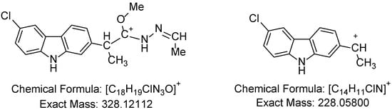 The APCI+ high-resolution mass spectra were obtained using a mixture of DMSO+MeOH. The [M+H]+ molecular peaks were identified as base peaks for five substances, while the mass spectrum of 1f was observed with a relative intensity of 70%. The presence of the molecular peaks as base peaks or with high relative intensity in the case of 1f is evidence of the compounds’ identity and purity. The additional peaks identified in the mass spectra of the compounds align with the [C18H19ClN3O]+ and [C14H11ClN]+ cations at calculated m/z values of 328.12112 and 228.05800, for which the proposed structures are depicted on Figure 3. The two methyl groups attached in the fragment at a calculated m/z of 328.12112 probably result from the measurement in a methanolic solution.