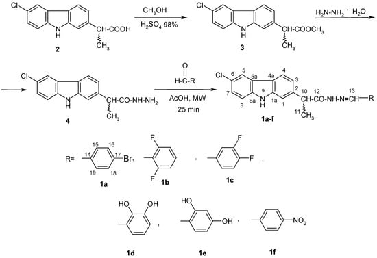 For the synthesis of (EZ)-N’-benzylidene-2-(6-chloro-9H-carbazol-2-yl)propanehydrazide derivatives (1a–f), 2-(6-chloro-9H-carbazol-2-yl)propanehydrazide (4) (0.001 mol) and various aromatic aldehydes (0.001 mol) in 3 mL of absolute methanol and four drops of the catalyst (glacial acetyl acid) were introduced into a microwave tube. The reaction mixture underwent pre-stirring for 5 min, followed by irradiation for 25 min at 90 °C with very high absorption. Once the designated time elapsed, the mixture was cooled to room temperature and refrigerated overnight. The resulting product was then filtered and subjected to recrystallization from a 1:2 mixture of isopropanol and water.