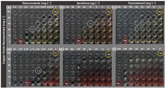Checkerboard assay performed with NCuO combined with three fungicides: Tebuconazole, Iprodione, and Pyrimethanil against Botrytis cinerea (a–c) and Fusarium oxysporum (d–f). The values in the wells represent the calculated FIC in the combinations where fungal growth was absent. The yellow and red circles highlight the NCuO and fungicide MIC, respectively. Dashed circles highlight the FIC of synergistic interactions (i.e., <0.5).