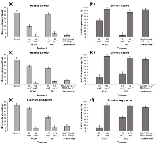 Effect of the NCuO combined with fungicides (synergistic concentrations) on B. cinerea (a–d) and F. oxysporum (e,f) mycelial biomass. The effect of NCuO and fungicide used alone are also included with their respective MIC. The inhibition was calculated as dry mycelial weight and as inhibition percentage. The results are presented as the mean ± the standard deviation of the triplicates. Different letters above the bars represent different statistical groups by Tukey-HSD comparisons at p ≤ 0.05.