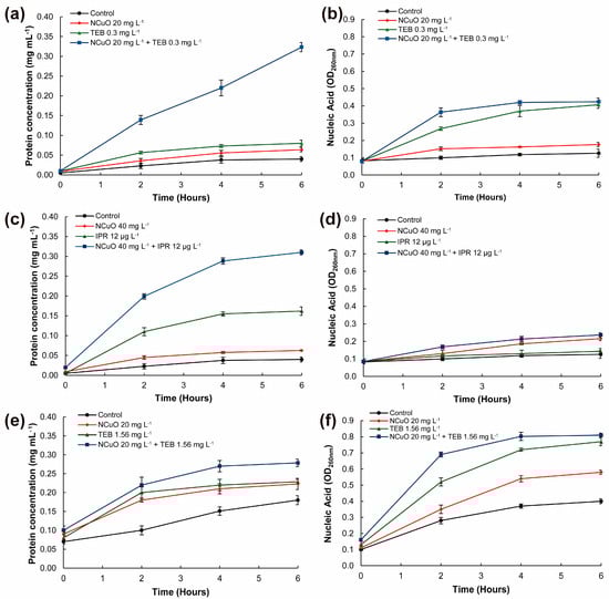 Synergistic concentrations of NCuO combined with Tebuconazole and Iprodione inducing cellular leakage on Botrytis cinerea (a–d) and Fusarium oxysporum (e,f) mycelia. Soluble protein (a,c,e) and nucleic acids (b,d,f) were determined from filtered solutions.