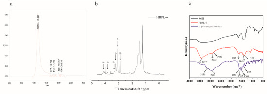 Structural characterization of polylysine. (a) The GPC spectra of HBPL-6 and the polymer show unimodal distributions. (b) 1H NMR of HBPL-6 in D2O. (c) FTIR spectra of L-lysine, KOH, and HBPL-6 in the 4000–500 cm−1 range.