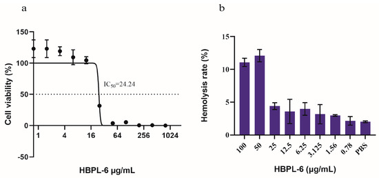 The cytotoxicity tests we conducted showed that HBPL-6 presented no cytotoxicity values lower than 12.5 μg/mL, and the survival rate reached 100% (Figure 2a). The IC50 (the concentration at which the cell viability was reduced to 50%) value was calculated as 24.24 μg/mL, which presented a 50% reduction in the viable counts of Vero cells compared to the buffer treatment. The hemolytic toxicity test presented similar results; 10% of red blood cells were lysed with 50 μg/mL of HBPL-6 (HC10 = 50 μg/mL), suggesting an outcome of partial hemolysis, whereas at a value lower than 25 μg/mL, it was less than 5%, indicating an absence of hemolytic toxicity (Figure 2b). Based on these results, it can be observed that the cytotoxicity and hemolytic properties of HBPL-6 generally increase with the concentration.