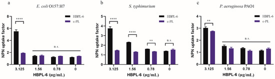 NPN fluorescence values of HBPL-6 compared with ε-PL. (a–c, respectively) E. coli O157:H7, S. typhimurium, and P. aeruginosa PAO1 treated with the addition of different concentrations (0.78–3.125 µg/mL) of HBPL-6 and ε-PL. (n.s.: not significant; *: p < 0.05, **: p < 0.01, ***: p < 0.001, ****: p < 0.0001).