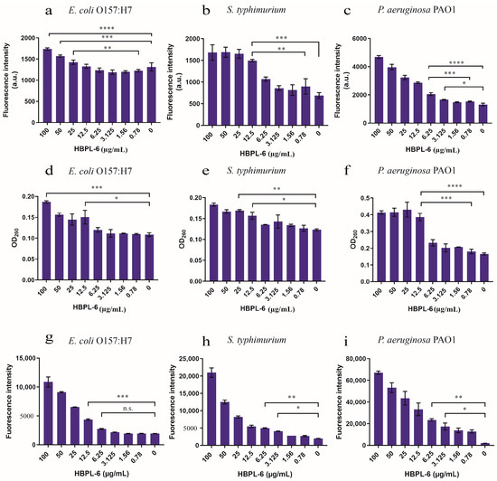 The assessment of outer-membrane permeabilization by the HBPL-6 of G− bacteria. (a–c) PI fluorescence intensities of the additions of different concentrations of HBPL-6 (0.78–100 µg/mL) for the 30 min incubation periods of E. coli O157:H7, S. typhimurium, and P. aeruginosa PAO1, respectively. (d–f, respectively) Presence of 260 nm absorbing materials in the supernatants of E. coli O157:H7, S. typhimurium, and P. aeruginosa PAO1 treated with HBPL-6 (0.78–100 µg/mL). (g–i, respectively) Total ROS accumulation values for E. coli O157:H7, S. typhimurium, and P. aeruginosa PAO1 treated with HBPL-6 (0.78–100 µg/mL). The data are the average triplicates using a non-parametric one-way ANOVA test. (n.s.: not significant; *: p < 0.05, **: p < 0.01, ***: p < 0.001, ****: p < 0.0001).