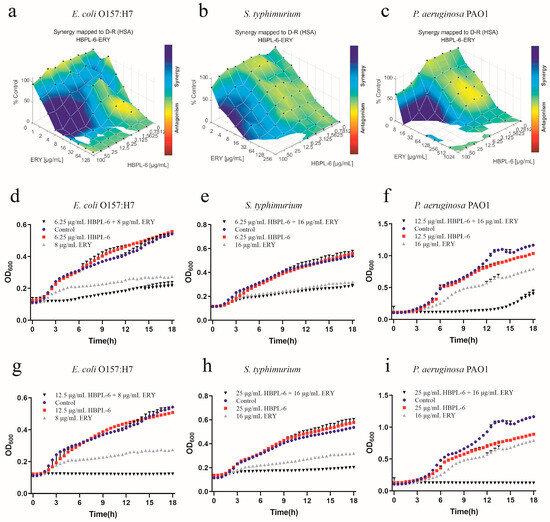 Plots were generated using the Combenefit program for the synergistic potentiation result for the use of HBPL-6 on erythromycin. (a) E. coli O157:H7 with HBPL-6 (0–100 μg/mL) and erythromycin (0–128 μg/mL). (b) S. typhimurium with HBPL-6 (0–100 μg/mL) and erythromycin (0–256 μg/mL). (c) P. aeruginosa PAO1 with HBPL-6 (0–100 μg/mL) and erythromycin (0–1024 μg/mL). Growth curves for single- and dual-drug combinations (d,g, respectively): E. coli O157:H7 with 6.25 and 12.5 μg/mL dose administrations of HBPL-6 and 8 μg/mL of erythromycin. (e,h) S. typhimurium with 6.25 and 25 μg/mL dose administrations of HBPL-6 and 16 μg/mL of erythromycin. (f,i) P. aeruginosa PAO1 with 12.5 and 25 μg/mL dose administrations of HBPL-6 and 16 μg/mL of erythromycin.