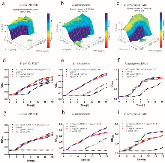 Plots were generated using the Combenefit program for the synergistic potentiation result for the use of HBPL-6 on colistin. (a) E. coli O157:H7 with HBPL-6 (0–100 μg/mL) and colistin (0–16 μg/mL). (b) S. typhimurium with HBPL-6 (0–100 μg/mL) and colistin (0–16 μg/mL). (c) P. aeruginosa PAO1 with HBPL-6 (0–100 μg/mL) and colistin (0–16 μg/mL). Growth curves for single- and dual-drug combinations (d,g, respectively): E. coli O157:H7 with 3.125 and 6.25 μg/mL doses of HBPL-6 and 0.25 μg/mL of colistin. (e,h) S. typhimurium with 0.78 and 1.56 μg/mL doses of HBPL-6 and 2 μg/mL of colistin. (f,i) P. aeruginosa PAO1 with 6.25 and 12.5 μg/mL doses of HBPL-6 and 1 μg/mL of colistin.