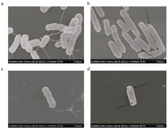 SEM of S. typhimurium. (a) Untreated; (b) treated with HBPL-6 at a dose of 12.5 μg/mL; (c) treated with colistin at a designated FIC value (1 μg/mL); (d) treated with HBPL-6 and colistin at the synergistic concentration.