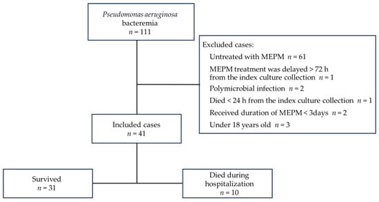 In total, 111 patients with P. aeruginosa bacteremia were screened for this retrospective study from January 2009 to December 2022, and 41 fulfilled the inclusion criteria, excluding 70 patients who met the exclusion criteria (Figure 1).