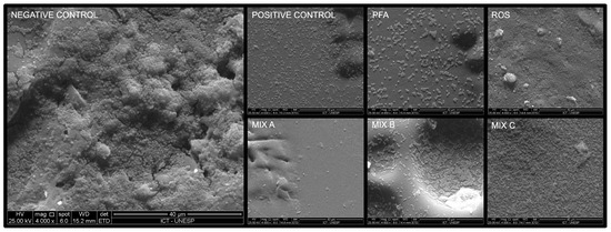 The microbial biofilms in scanning electron microscopy. (Brain heart infusion broth (Negative control), chlorhexidine digluconate 0.06% (Positive control), P. paniculata (PFA), R. officinalis (ROS), P. paniculata and R. officinalis 75% + 25% (Mix A), P. paniculata and R. officinalis 50% + 50% (Mix B), P. paniculata and R. officinalis 25% + 75% (Mix C). The micrographs were taken at a magnification of 4000×).